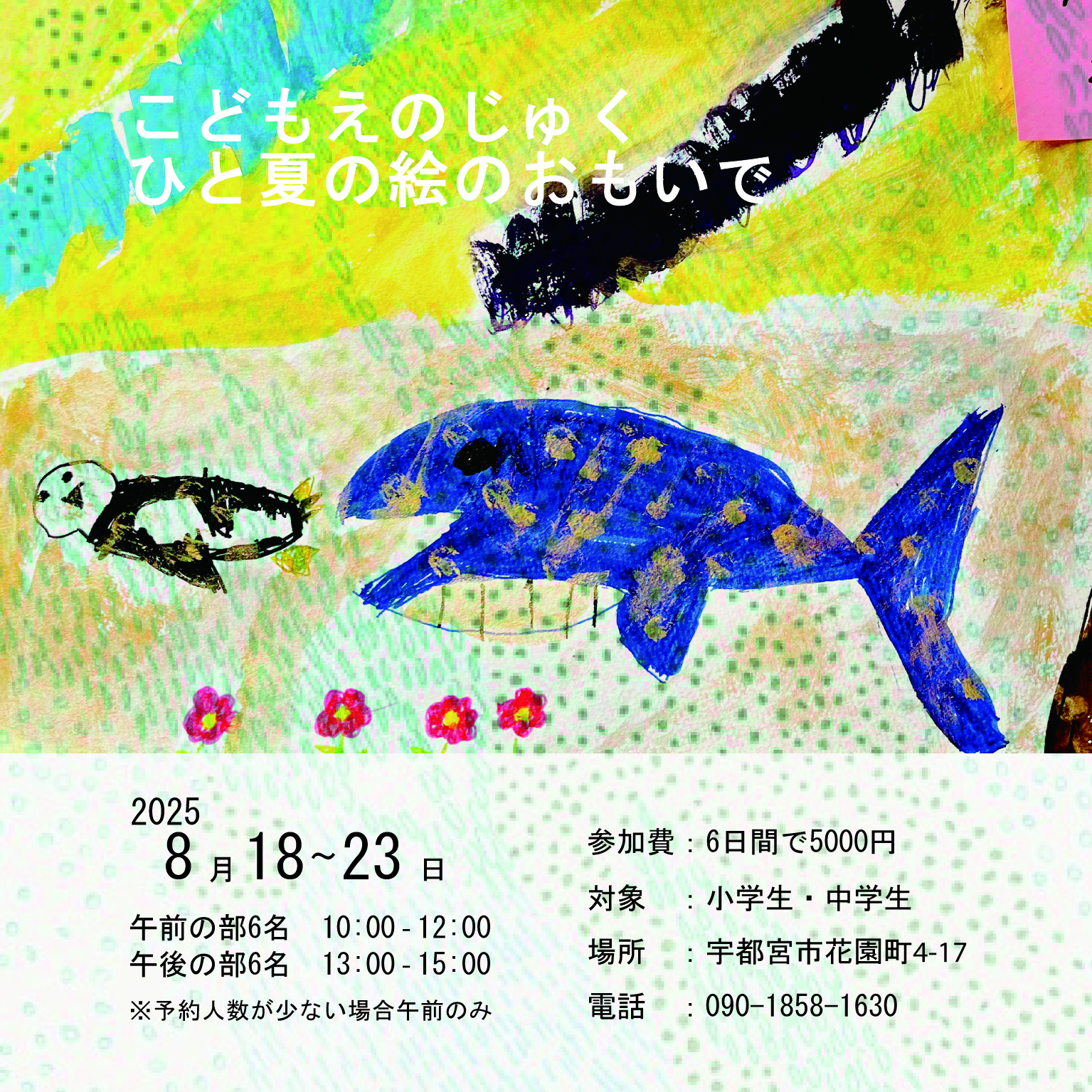 夏休みの絵の宿題を先生と一緒にやってみませんか。絵が好きな子も参加していいです。宿題だけじゃなくて好きな絵を描きに来るのでもいいです。全日程参加しなくても大丈夫です。