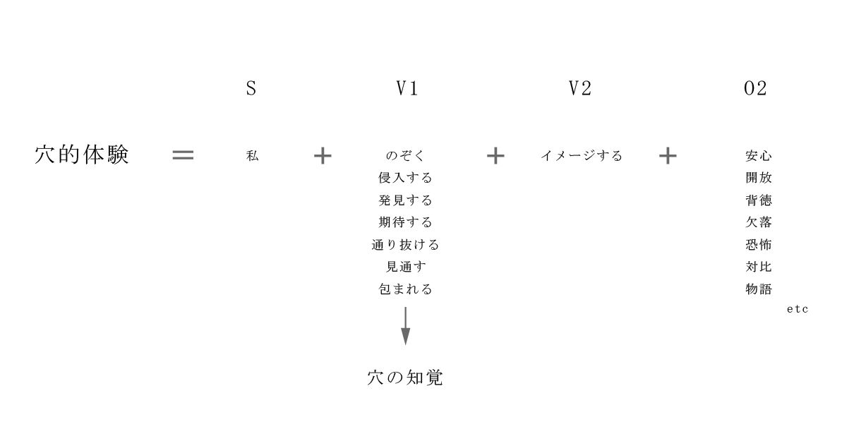 建物が死ぬときはいつだろう?壊れるときか、必要とされなくなったときか、時間が経つにつれて建物には穴が空いていきます。穴が大きくなると草や雨や虫などの自然が入り込んできて、穴はどんどん大きくなっていきます。街に空いている穴を観察しました。表面的な穴、空間的な穴、意味的な穴、死の予兆としての穴、物語を想起させる穴、、いろいろな穴が見つかりました。私をワクワクさせるそれらを採取し、「穴の空間文法」をつくりました。