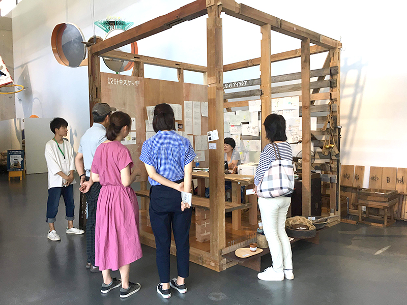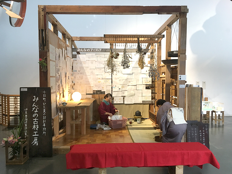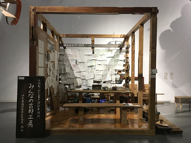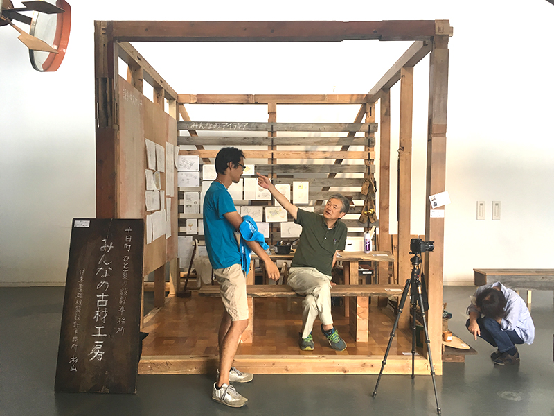 十日町の方々から不要な家具や古材を頂き、それをもとに会場となる小屋のなかでお客さん・東京の伊東事務所とともに何に使えるかアイデアを出し、小屋の中はアイデアでいっぱいになりました。それを持ってまちに繰り出し、その中で欲しいものはないかなど聞き取りを行い、実際にものや家具をつくってまちに還元しました。この過程で小屋の風景がうつろいゆく川の景色のようにどんどんと変化していきました。